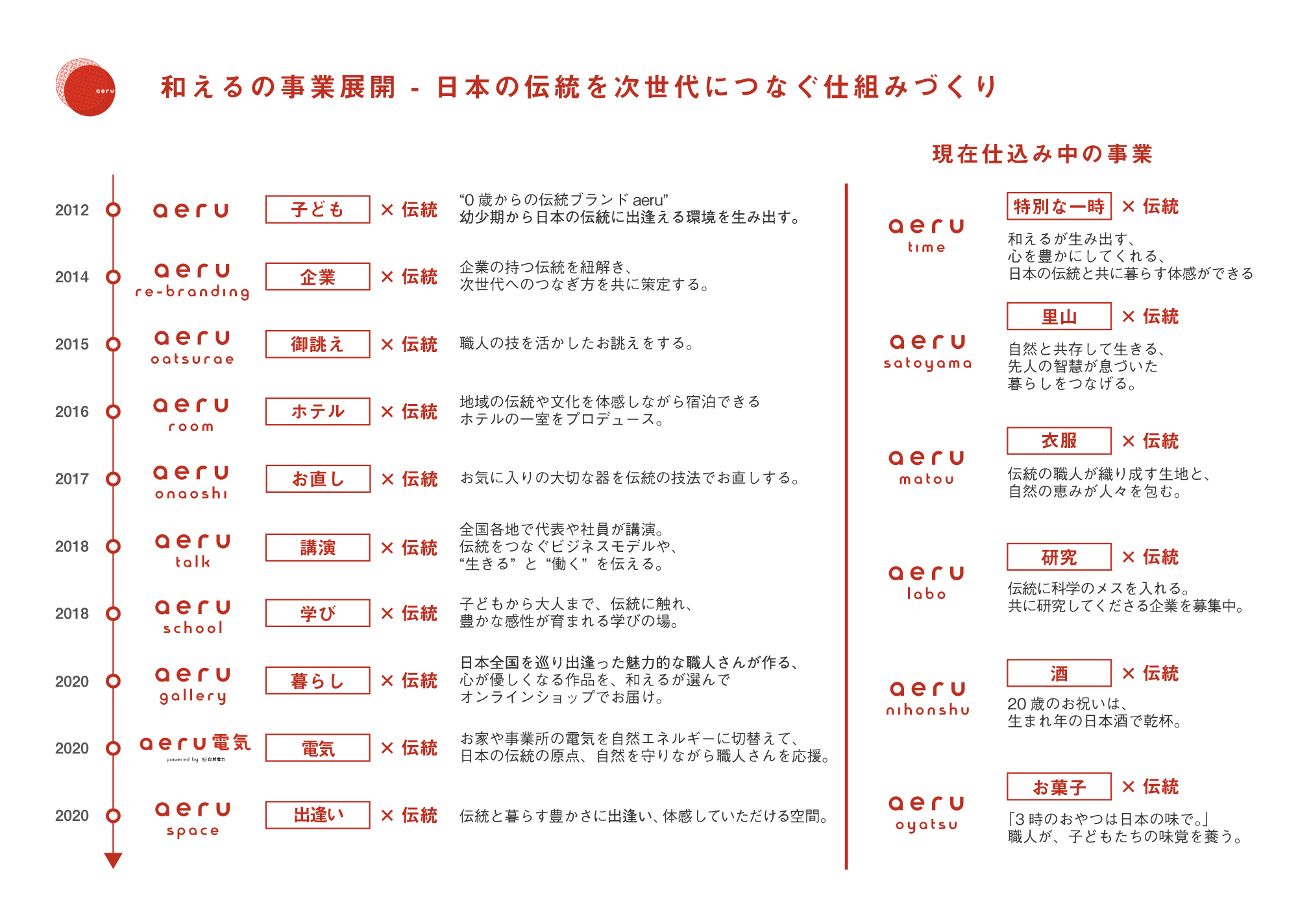 日本の伝統と現代人の感性や感覚を和え、暮らしの中で活かせる環境を生み出す、“0歳からの伝統ブランドaeru ”を創業事業として和えるの歴史がスタートしました。