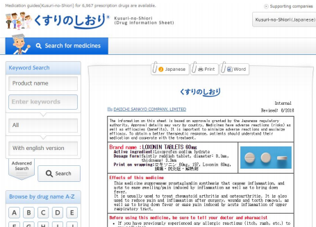 ▲英語版『くすりのしおり®』で「ロキソニン錠60mg」を調べた画面。