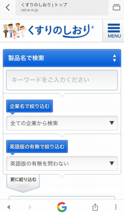 工藤さん:薬のことで困ったら「薬剤師に相談する」という選択肢があることを頭の片隅に置いていただけたらうれしいです。そのための一歩として、『くすりのしおり®』をどんどん活用してほしいですね。 与那覇:今回の取材で、僕自身も薬や薬剤師さんについての理解が深まりました。 本日はありがとうございました! 2017年10月現在(1997年公開開始) スマートフォンで『くすりのしおり®』を使って、薬の情報を探してみましょう。操作はとってもカンタン。まずは服用中の薬や、気になる薬を調べてみましょう。 (1)下記URLをクリックし、WEBサイト『くすりのしおり®』