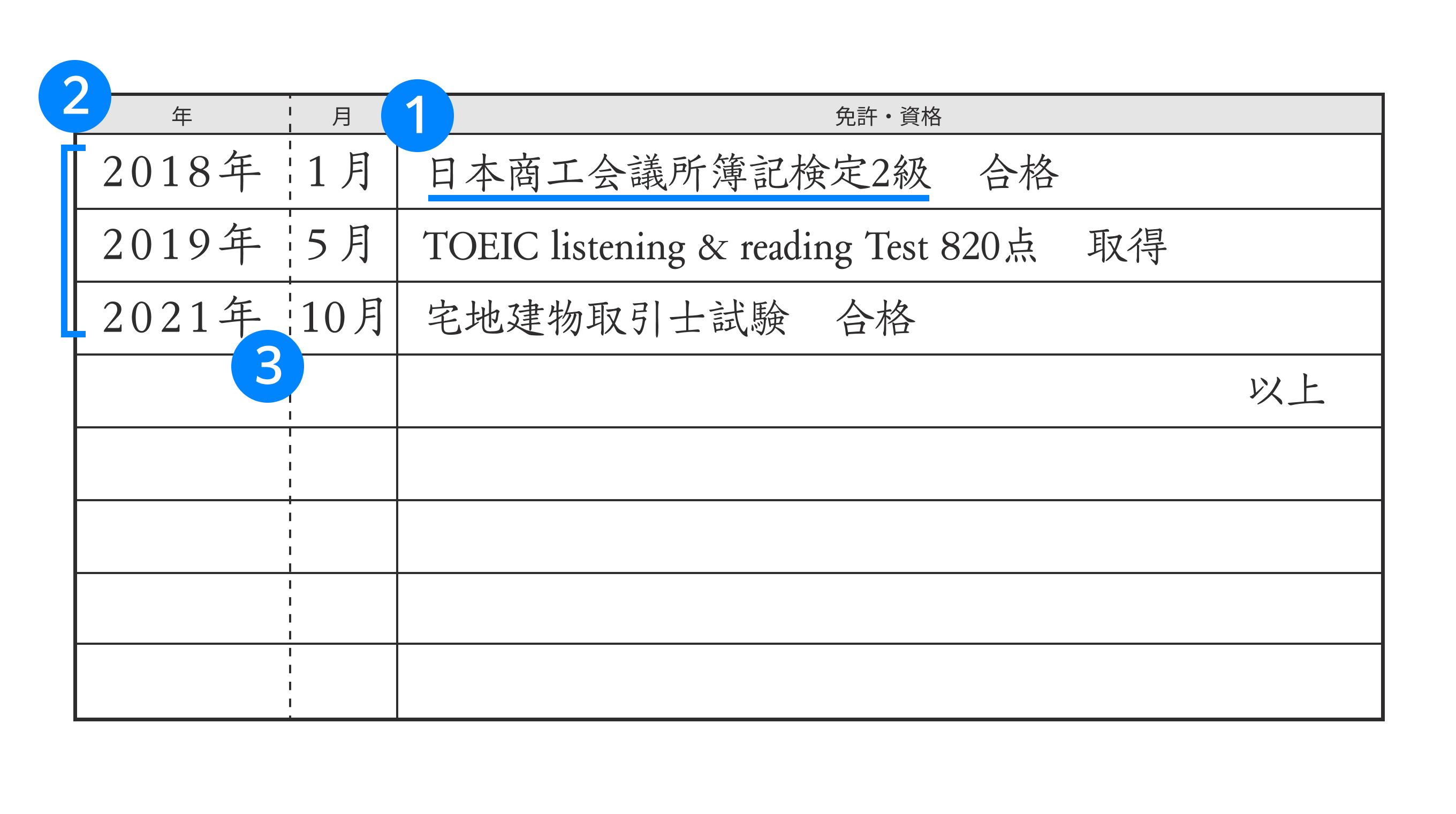 履歴書に書く資格は、その資格を取得・合格した順に上から記載します。