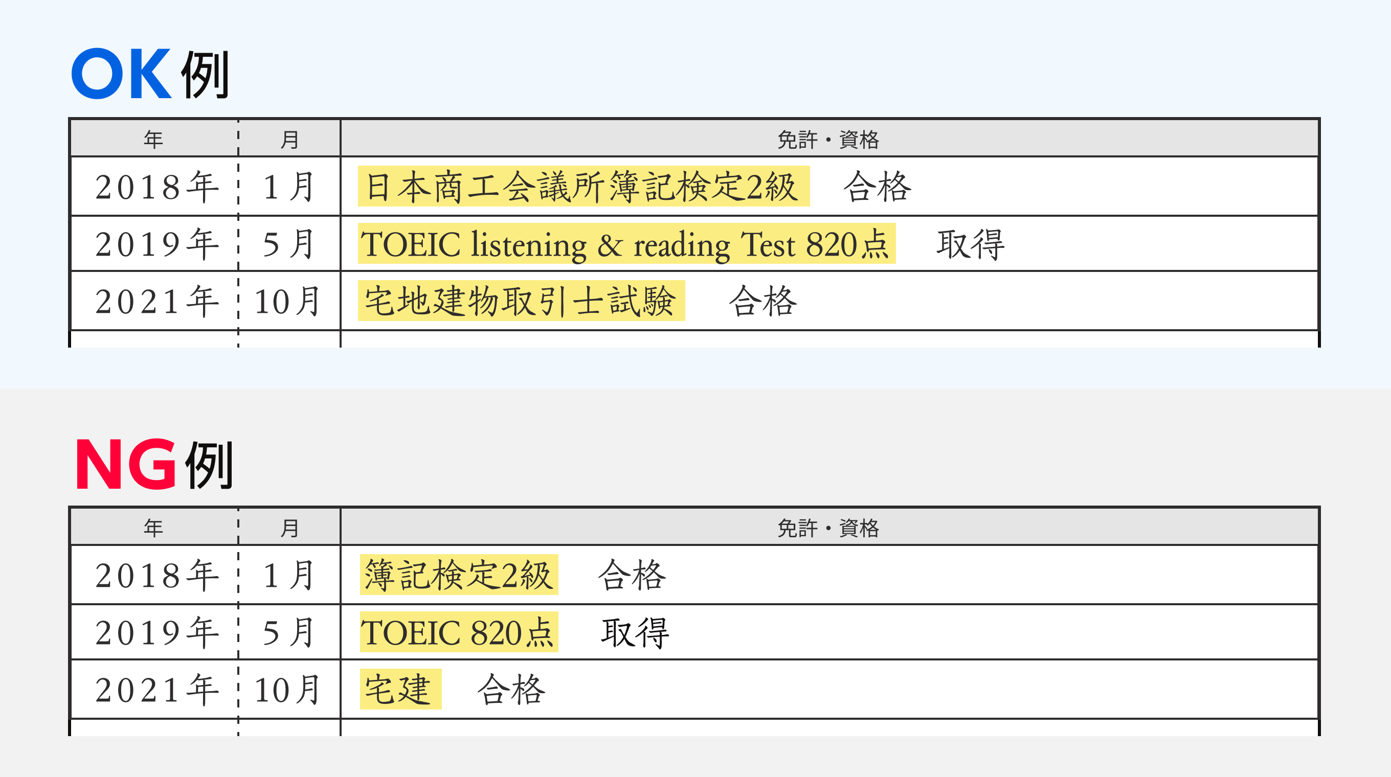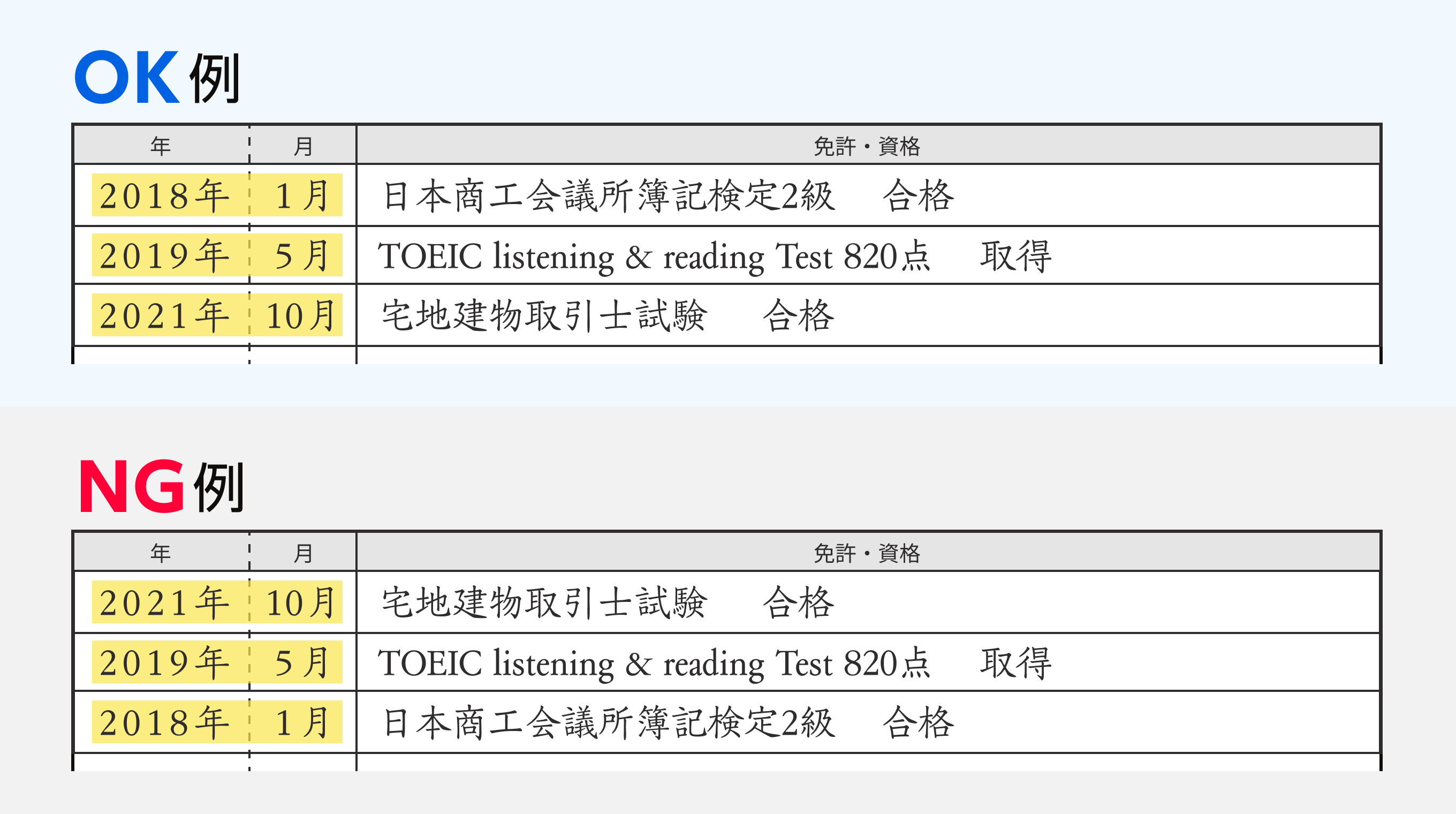履歴書の資格欄は、時系列に沿って記載した方が見やすくなります。