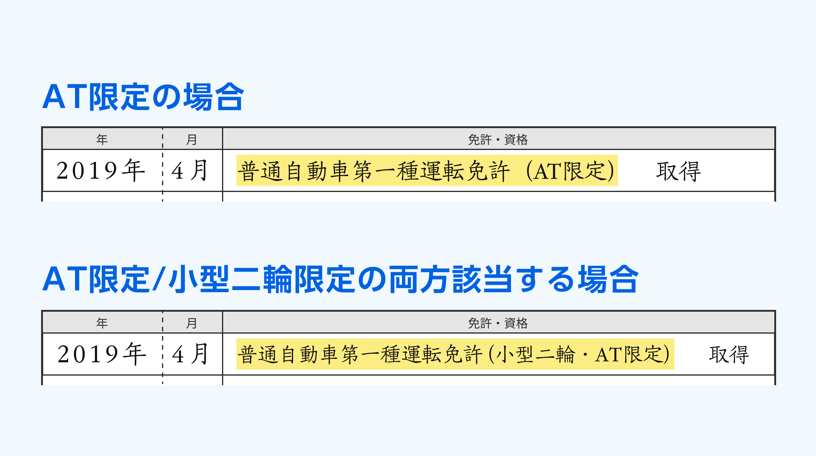 Q.オートマ限定(AT限定)/マニュアル(MT)などの限定表記はどうやって記載をするの?