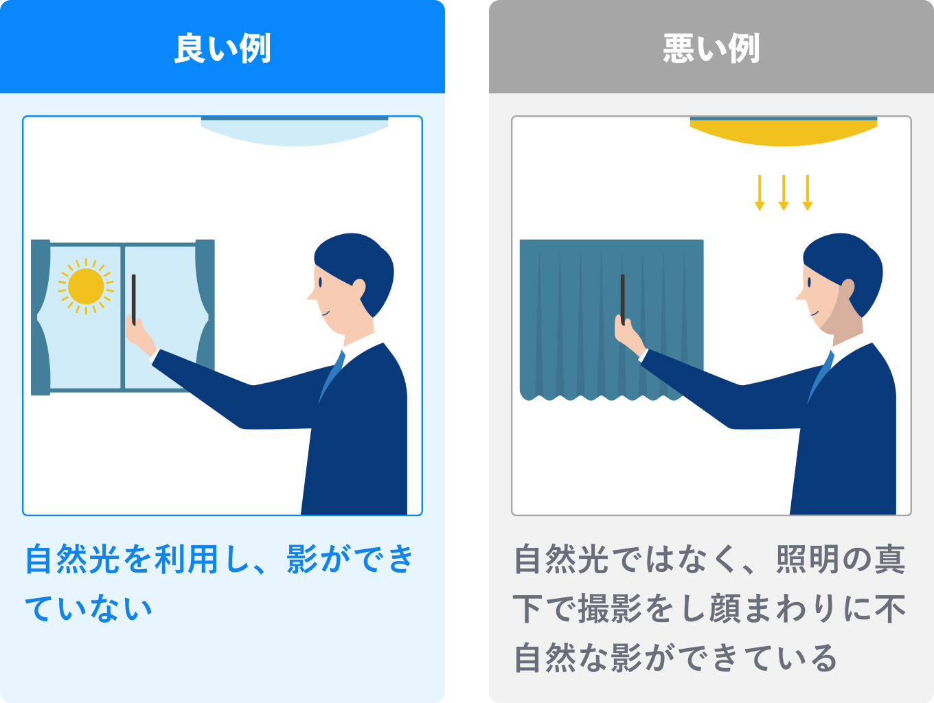 部屋の天井の照明の真下で撮影すると、前髪や顔の凹凸で顔に影ができてしまい、暗い印象を与えます。天井の照明を利用する場合は、離れた場所で撮影するようにしましょう。