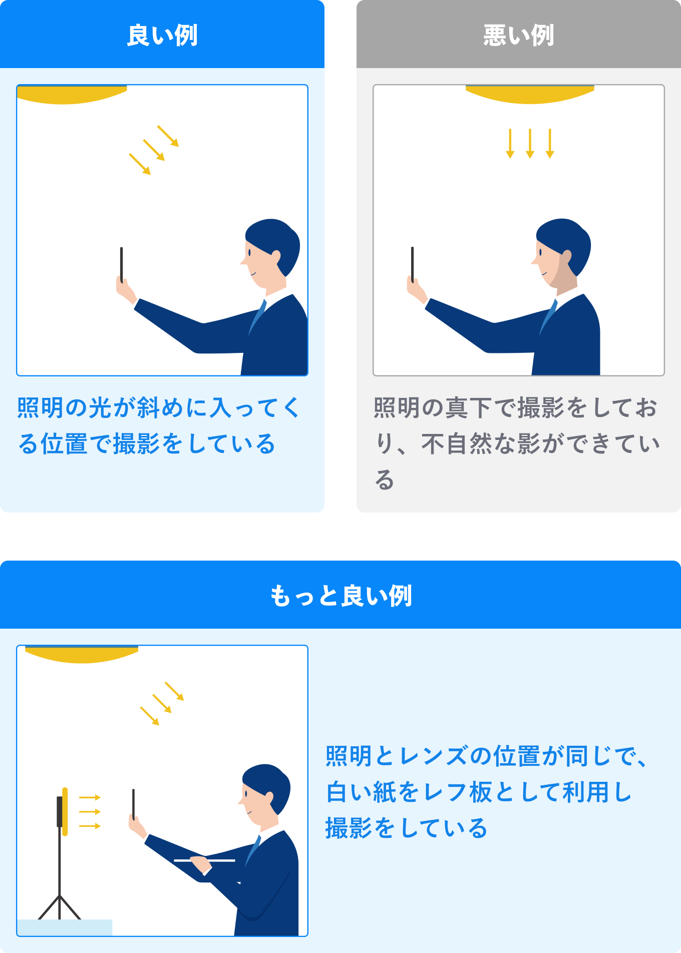 どうしても明るさが足りない場合は、正面から市販の撮影用ライトを当てて、顔の下で白い紙を持って撮影するという方法があります。白い紙がレフ板の役割を果たすので、ライトを当てるだけよりも明るく写るでしょう。