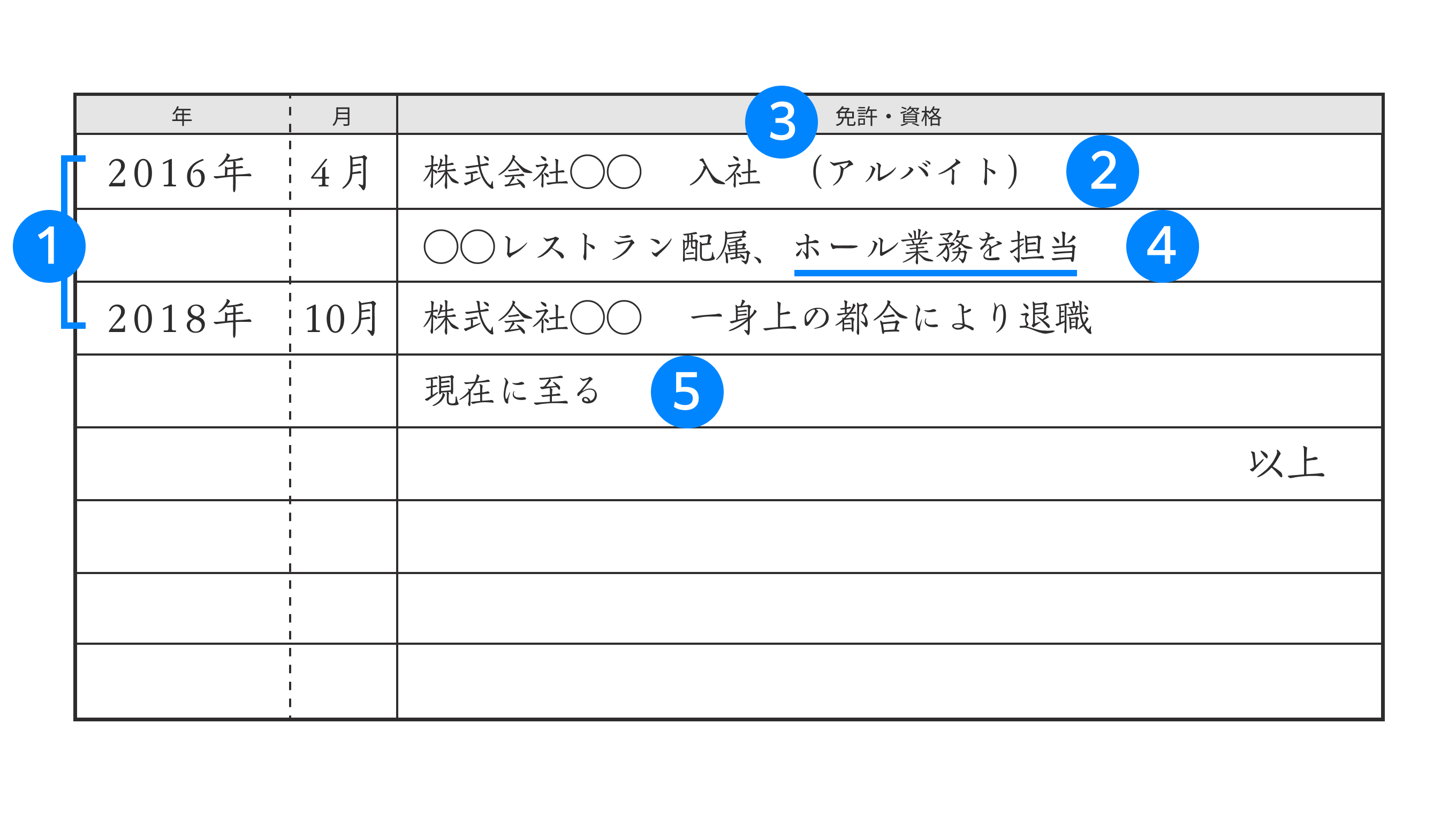 退職については、年月と企業名の後に、自己都合で退職した場合は「一身上の都合により退職」、会社都合の場合は「閉店のため退職」「シーズン終了のため退職」など簡単な退職理由を補足すると、状況を採用担当者に伝えることができるでしょう。
