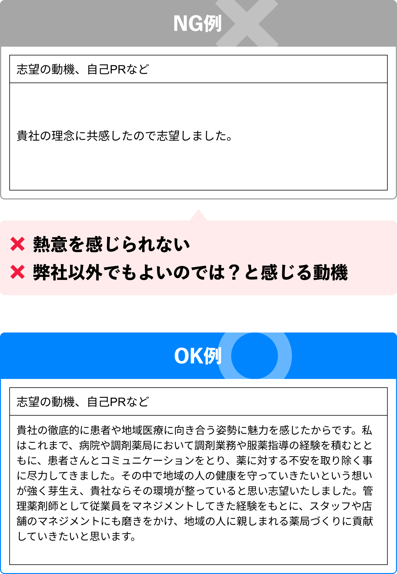 事前に情報収集を行い、応募先でなくてはならない理由を作成します。ありきたりな理由にすると「うちの調剤薬局でなくてもよいのでは?」と志望意欲を懸念される可能性があるので注意しましょう。 - 経験・強みを生かしてどのように貢献するかを記載する