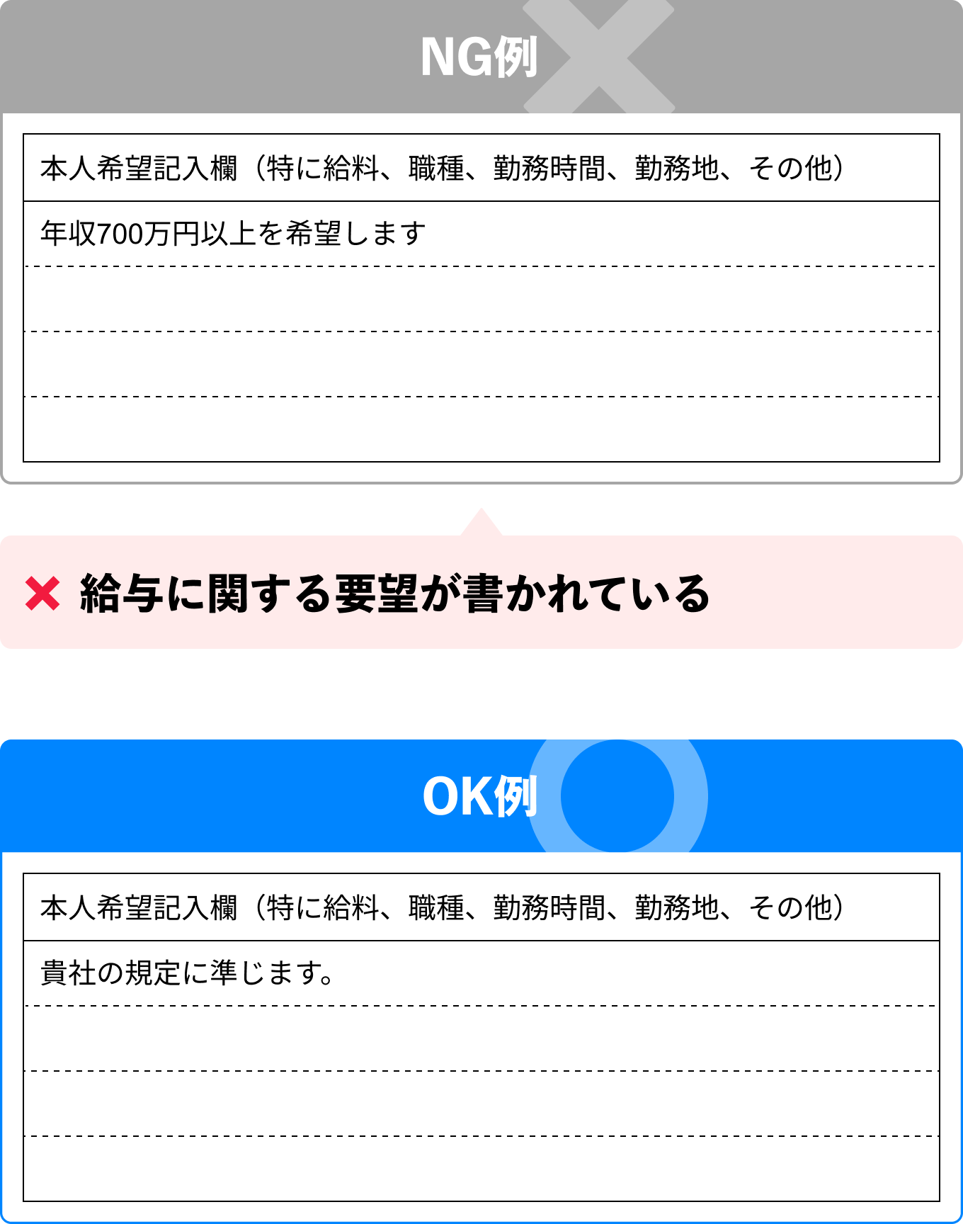 ただし、年収など待遇に関する希望を本人希望記入欄に記載すると、採用担当者に対し「具体的な話を聞く前に一方的に要望を伝える人物」という印象を与えてしまう可能性があります。