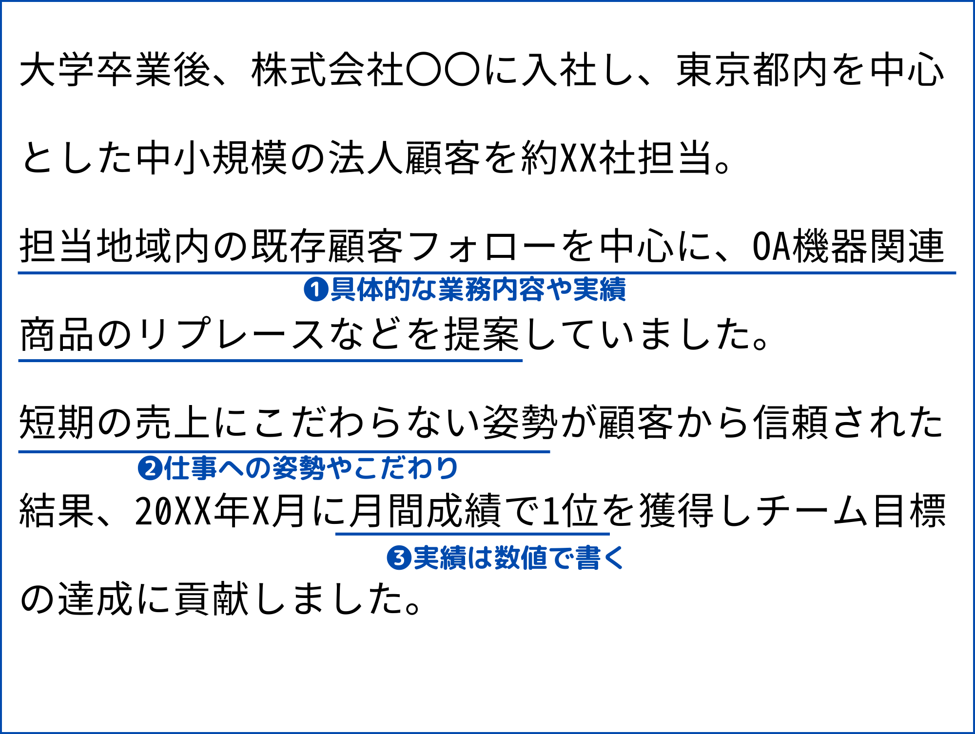 職歴がある場合は、経験のある業務や実績を数値を交えて書くとよいでしょう。