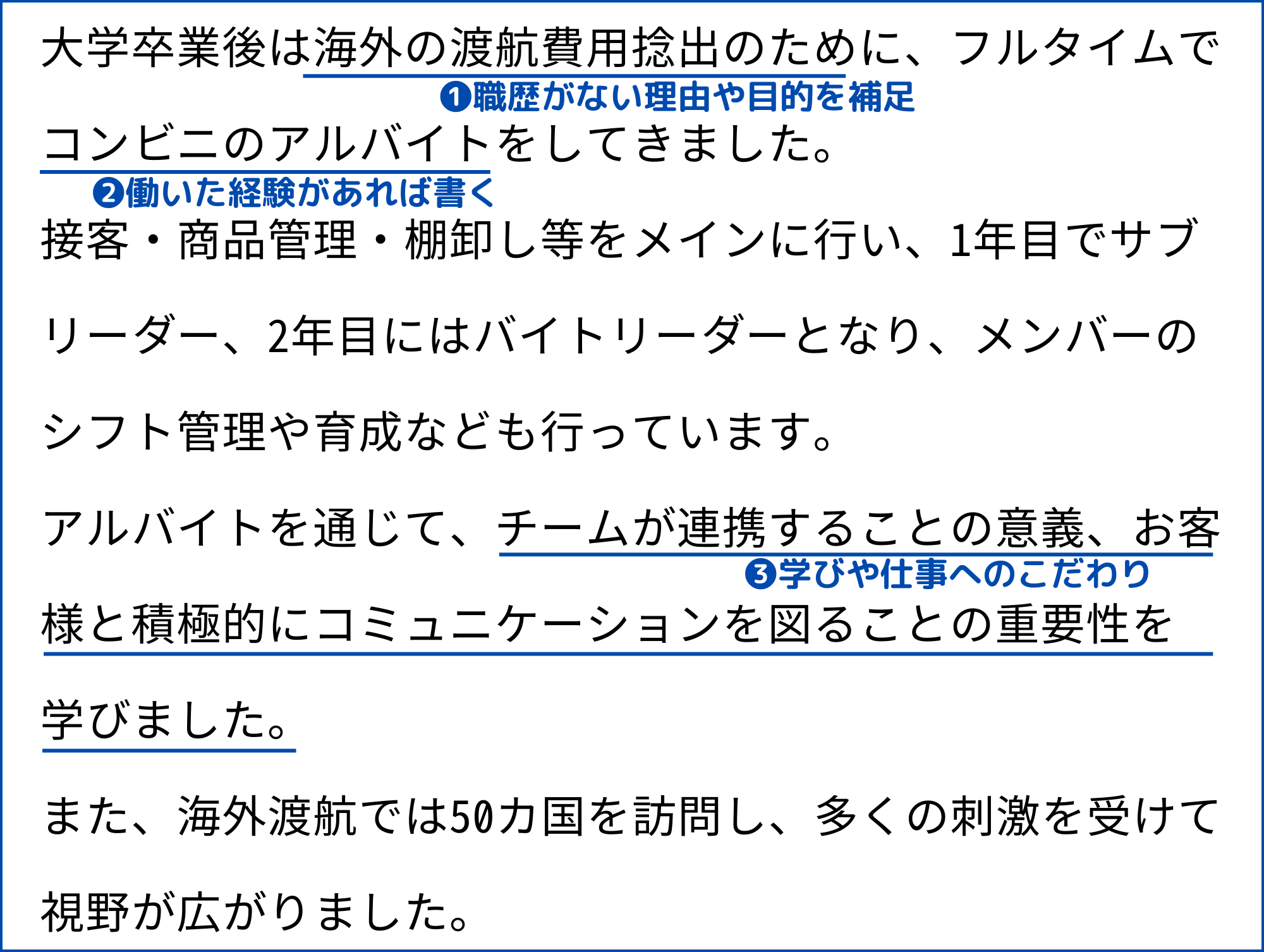 職歴がない場合は、社員にならなかった理由を伝え、働いた経験や応募先に生かせるスキルがあれば記載しましょう。