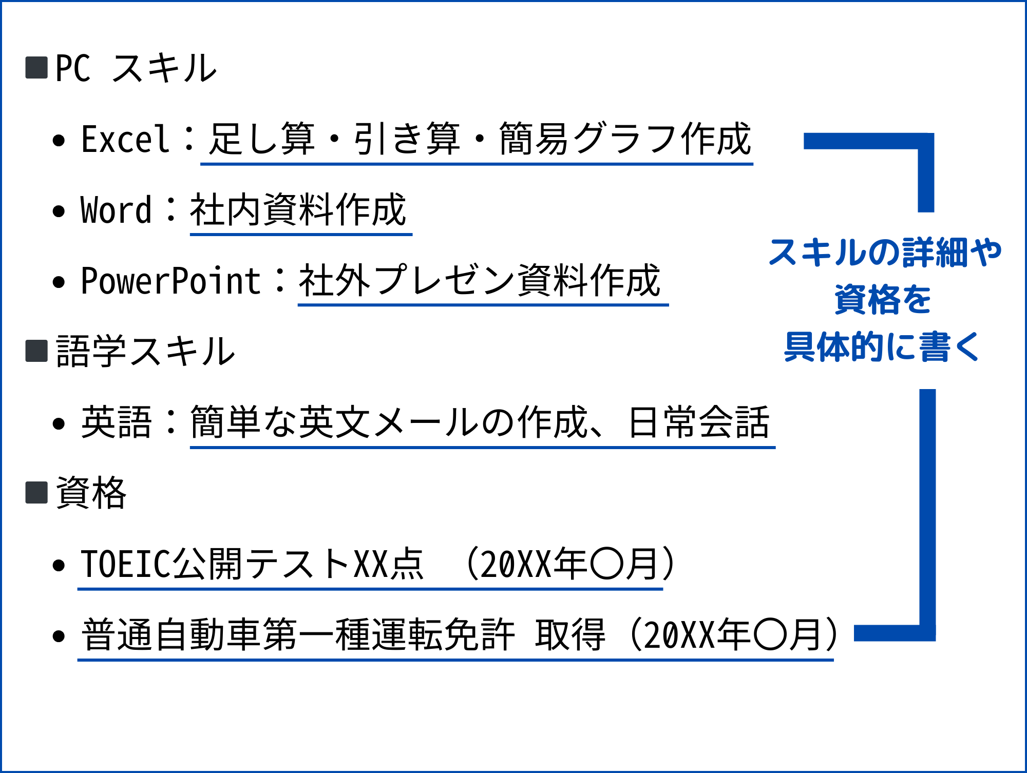 生かせる経験やスキルは職歴のありなしにかかわらず、PCスキルや資格などを具体的に書きましょう。