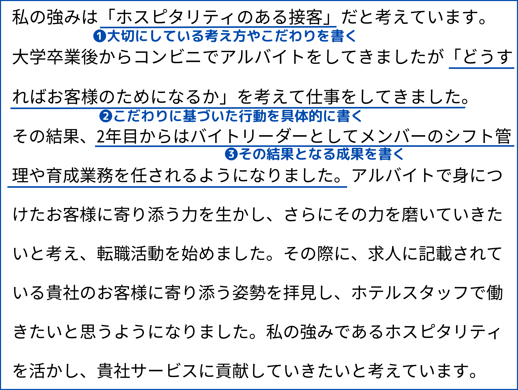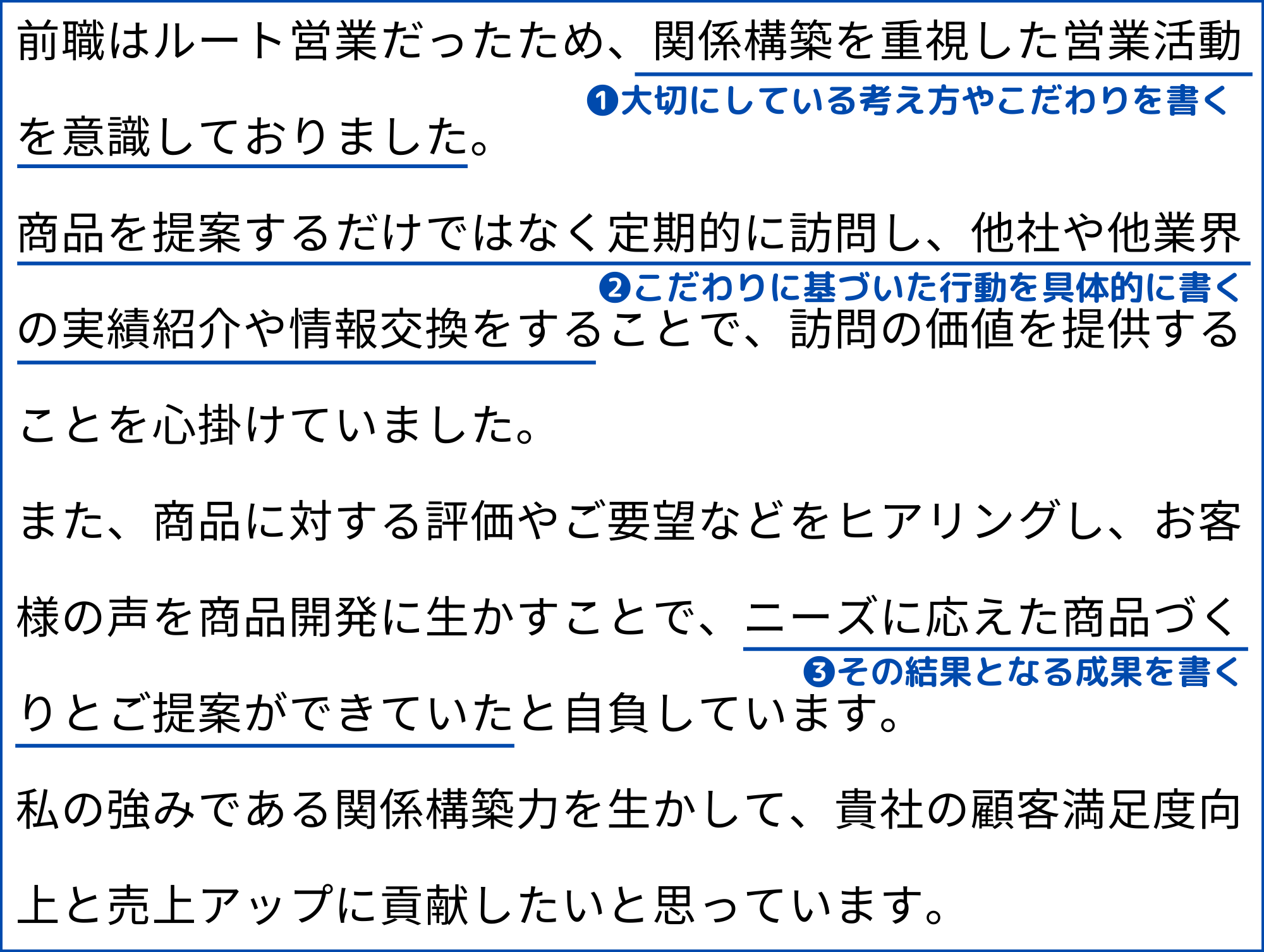 自分が大切にしている考え方やこだわりに従って行動したエピソードを交えます。エピソードが具体的であるほど人物像が明確になり、採用担当者が入社後のイメージをもちやすくなるでしょう。 - その結果となる成果を書く