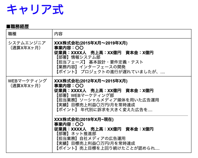転職・異動・出向・転籍などを含めて異業種・異職種の経験が多い場合、キャリア式にまとめることで、業界・職種経験が整理されます。