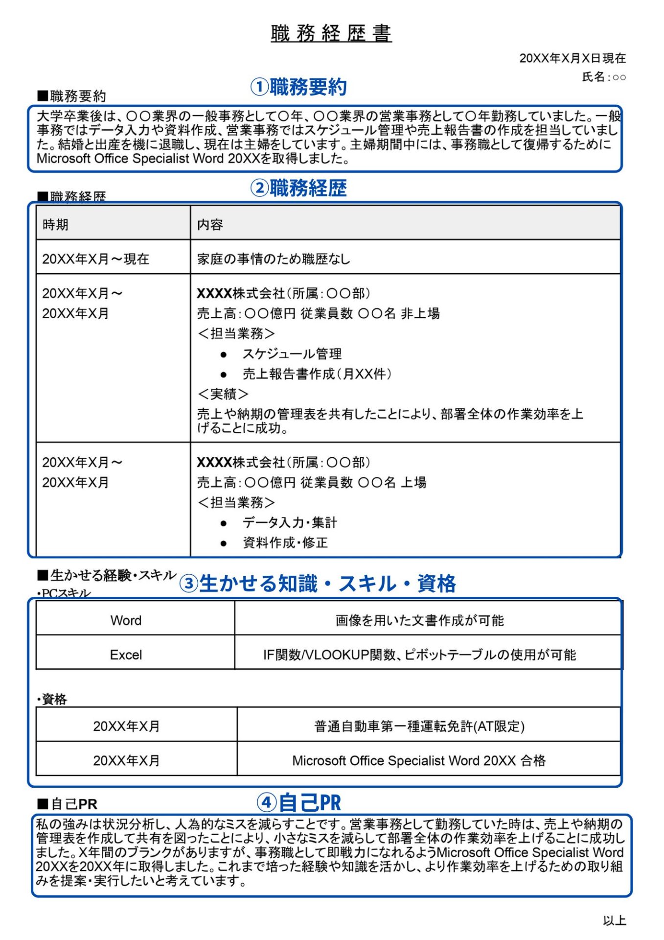 | 20XX | X | 一身上の都合により退職 |