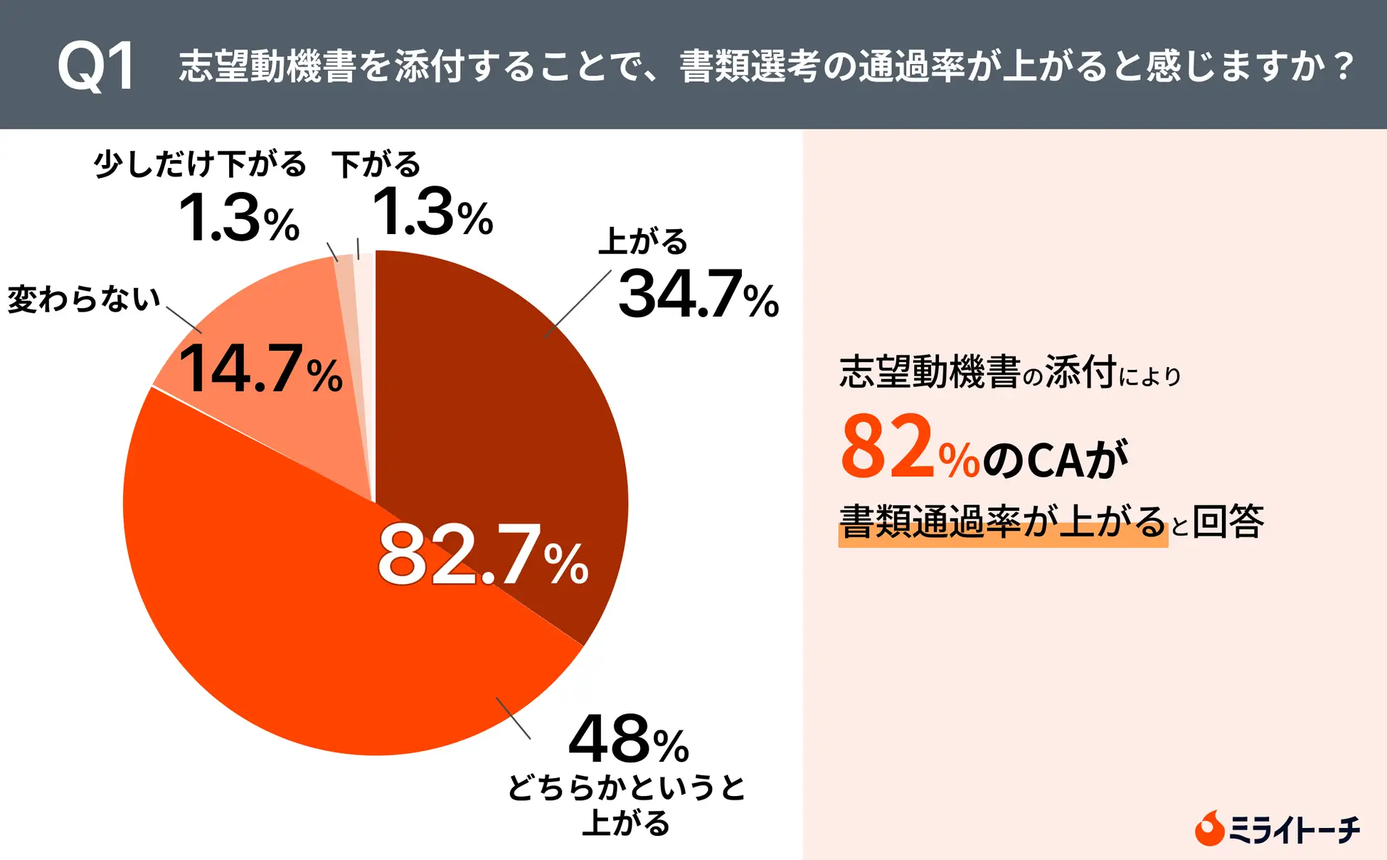 転職エージェントのキャリアアドバイザー150人に「志望動機書」に関するアンケートを実施し、転職活動の際、志望動機書を提出することで「書類選考の通過率が上がる」と回答したアドバイザーは82%という結果になりました。