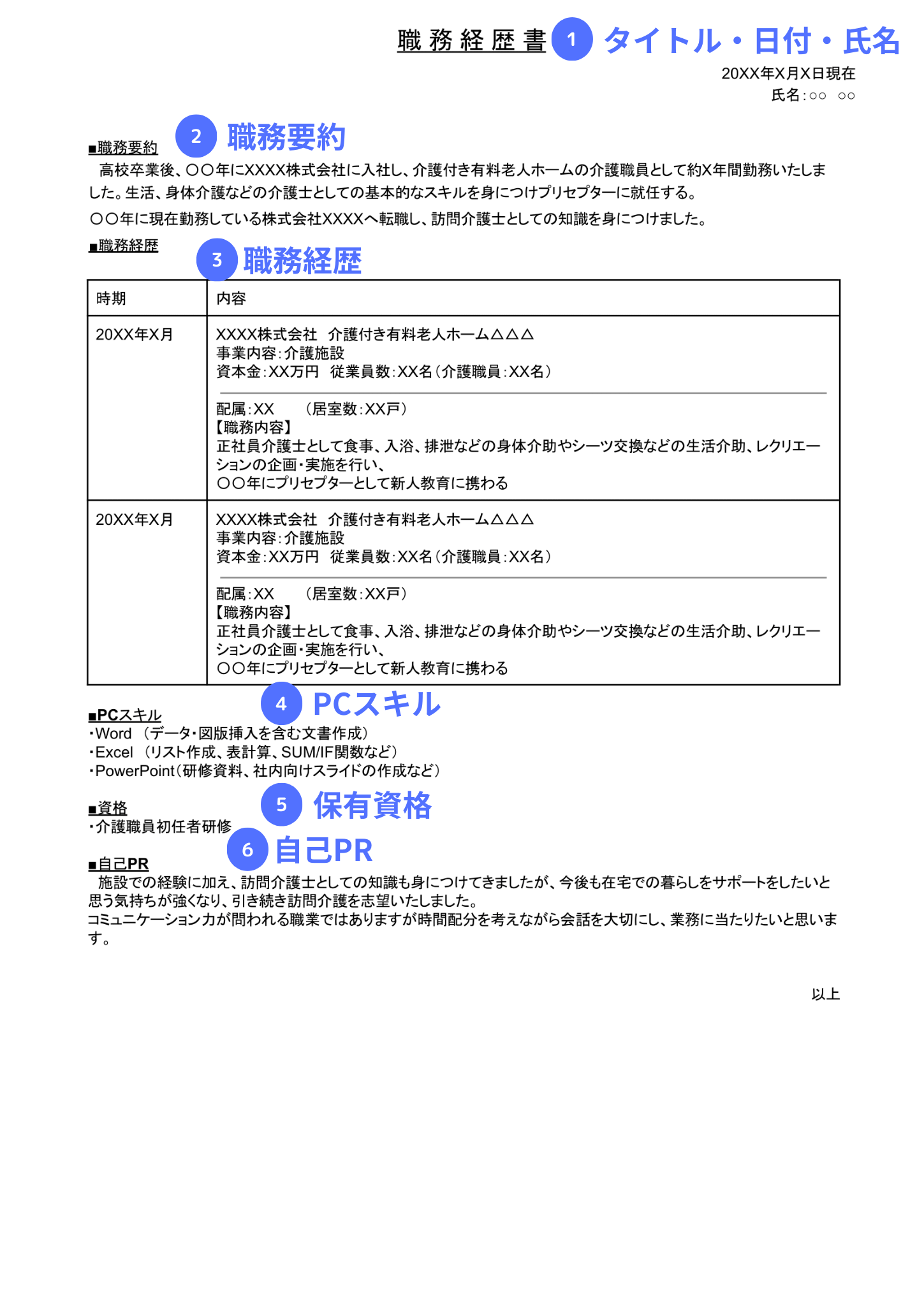 介護士の職務経歴書は、基本的に以下6点から構成されます。職務経歴書を作成する際は、以下の構成を参考にしながら作成しましょう。