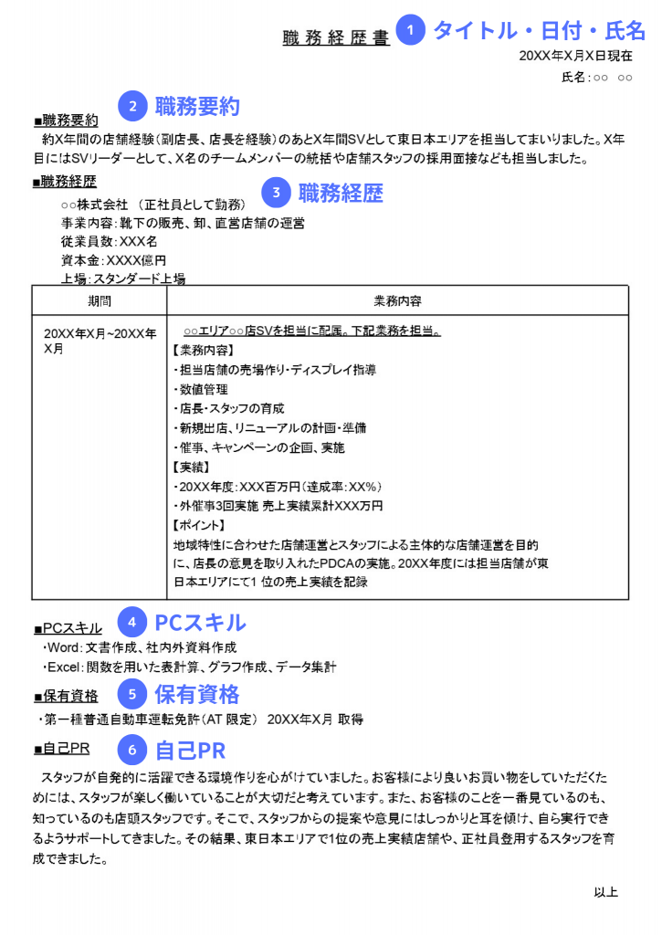 【見本1】アパレル販売員から事務職(サービス業)に転職した人の職務経歴書の実例